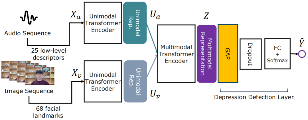 **方法:**文章介绍了一个名为D-Vlog的多模态数据集,用于检测抑郁症。作者开发的多模态深度学习模型利用了Transformer编码器来编码声学和视觉序列,并通过交叉注意力机制来融合这些特征,生成用于抑郁症检测的有效多模态表示。
