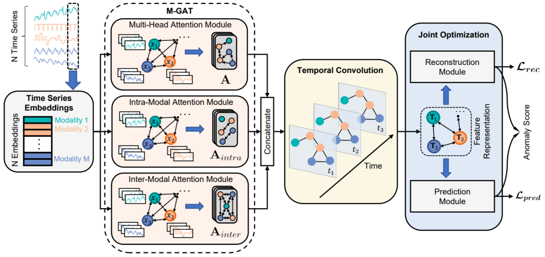 **方法:**论文提出了一种新的多模态时空图注意力网络(MST-GAT),用于多变量时间序列的异常检测。该网络通过显式捕捉不同模态单变量时间序列之间的空间-时间关系,通过这种多模态数据融合方法,MST-GAT能够更准确地检测出工业设备和信息技术系统中传感器的异常情况。