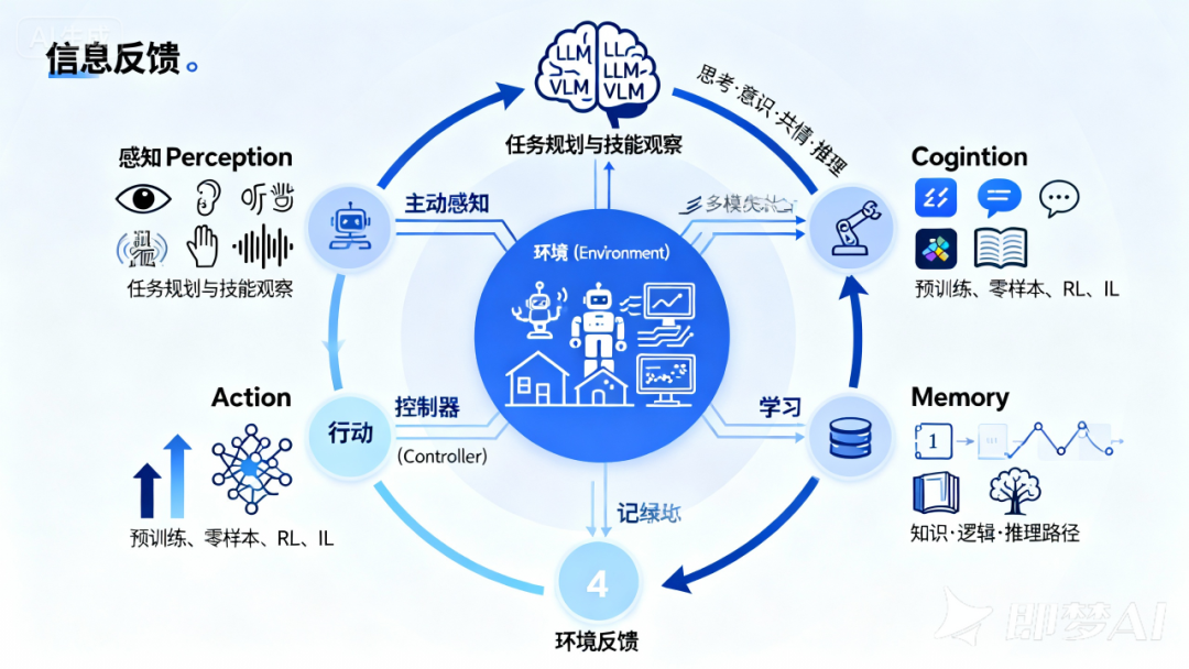 大语言模型和视觉语言模型在此发挥核心作用,为Agent提供了强大的世界知识、逻辑推理和上下文理解能力。当一个机器人接收到“帮我准备早餐”的指令时,认知模块会分解任务:识别厨房位置、定位冰箱、拿取食物等,并制定执行策略。