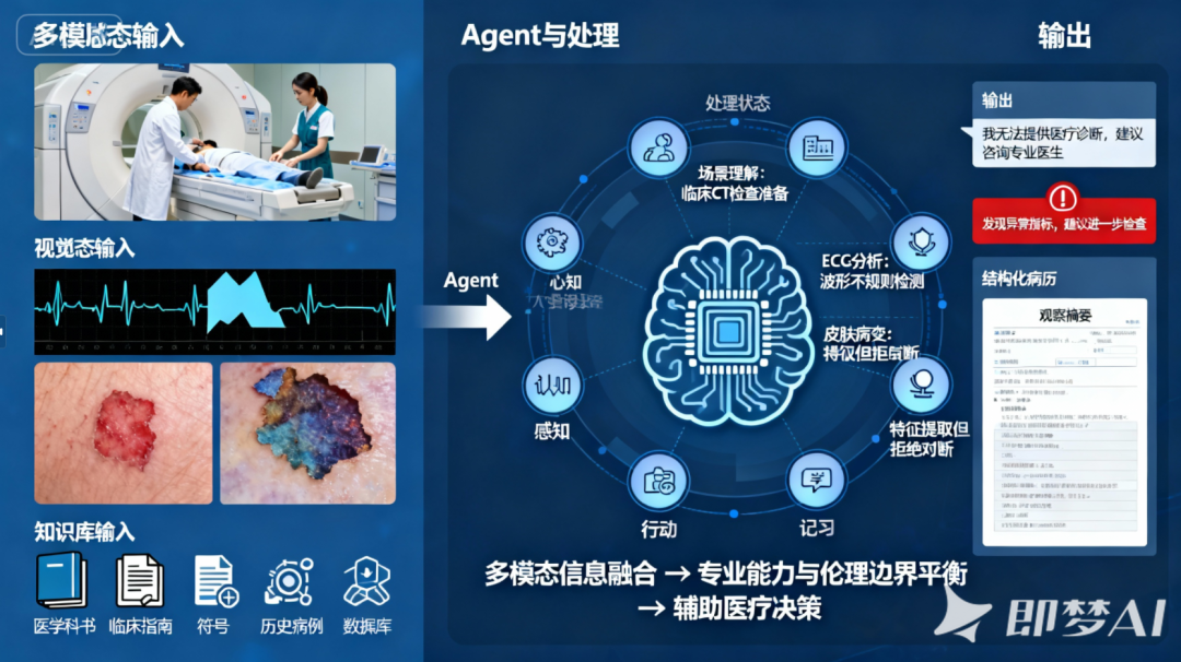 对于皮肤病变图像,Agent能够客观描述:“病变形状和颜色不规则,有不同深浅的棕色和棕褐色,似乎被小血管网络包围。”同时谨慎表示:“我无法提供医疗诊断。评估皮肤病变是恶性还是良性需要专业医学评估…”