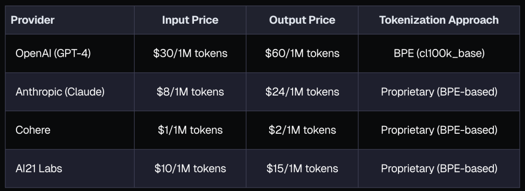 text = "The price is $1,234.56"# GPT-4 Tokenizer['The', 'Ġprice', 'Ġis', 'Ġ$', '1', ',', '234', '.', '56']# 9 tokens# Claude Tokenizer['The', ' price', ' is', ' $', '1', ',', '234', '.', '56']# 9 tokens