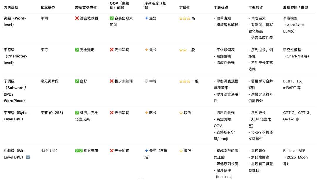 参考论文:Bit-level BPE: Below the byte boundary,作者认为在多语言/字符丰富(特别是 CJK:中文 / 日文 / 韩文)或含有大量表情符号/特殊符号的场景中,传统的字节级分词(即把字符转换为 UTF-8 字节,再做 BPE 合并)虽然能避免 OOV(未知词)问题,但带来一个大问题:序列长度显著增长,从而训练或推理时间、内存开销也变大。 为了解决这个问题,作者提出了 “bit-level BPE” 的想法:即在 比字节还小的单位(比特) 层面,做合并/压缩,从而 无损地 减少序列长度。 论文从 “UTF-8 编码结构” 入手,观察到在字节级表示里存在重复/冗余(比如某些 UTF-8 字节前缀在 CJK 范围里非常高频),从而提出“去重/压缩”的机制。 在实验中,在中文、日文、韩文语料上,作者测量了使用该方法之后的 序列长度缩短情况,以及“感知吞吐量”(perceived throughput,结合了序列长度、模型运算量等因素)变化。 论文也讨论了应用中的 trade-offs,比如在训练时模型需要处理稍微不同的 token 分布、可能的实现复杂度等。