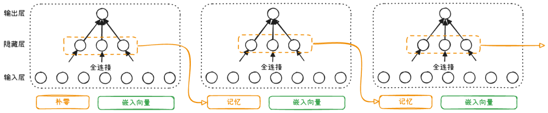 我们设定一个三层的神经网络,输入是token的嵌入向量,那么可以这样大致的描画循环神经网络的处理流程: