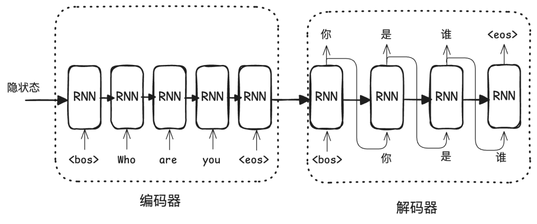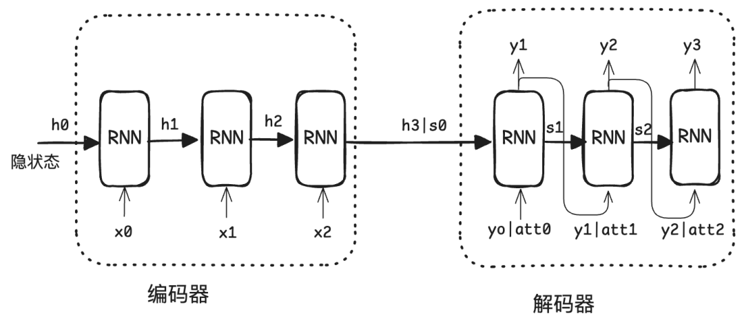 在解码器中,拼接的不再是简单的隐状态,而是注意力向量。基于这个注意力向量,模型能够关联原句中需要关注的部分。