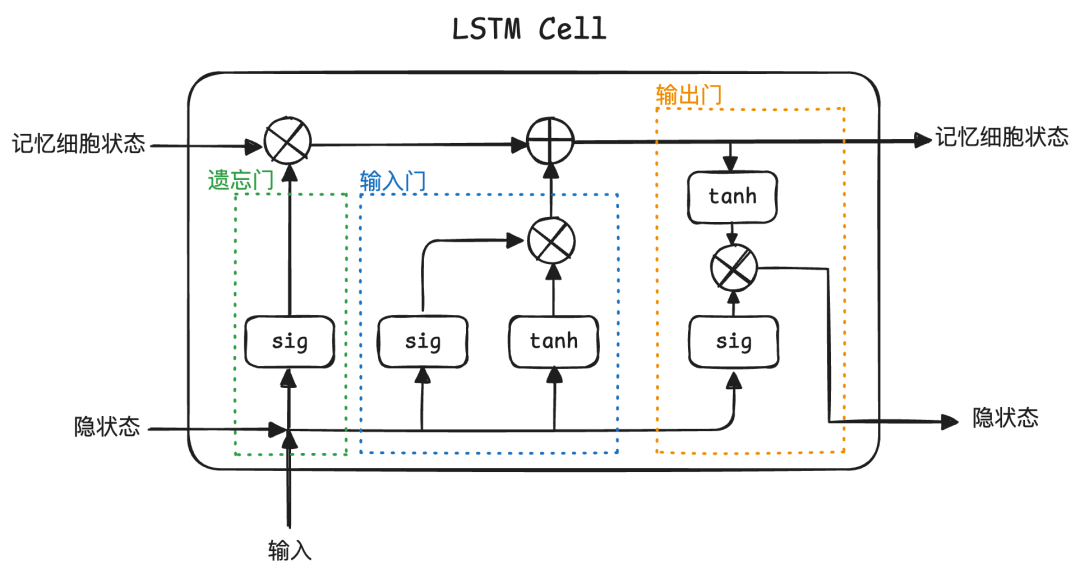 记忆细胞状态这个“长期记忆”的维护工作有遗忘门和输入门完成,直观理解就是首先通过遗忘门扔掉应该遗忘的信息,然后通过输入门加上应该记住的新的信息。