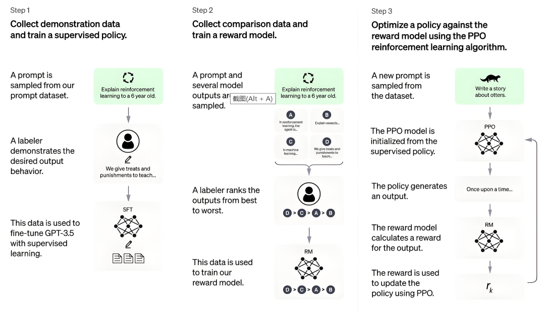 在SFT中,预训练模型首先被加载并固定在初始状态。然后,在给定的标注数据集上进行微调。与一般的微调方法类似,SFT的目标是通过引入任务特定的监督信号(例如标签或目标输出),让模型在目标任务上进一步优化。