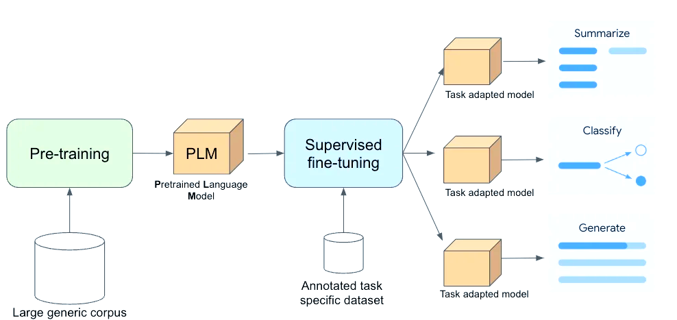 核心思想是“迁移学习”: 利用预训练模型已有的知识(如语言理解能力),通过微调快速适配新任务(如文本分类、对话生成)。