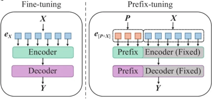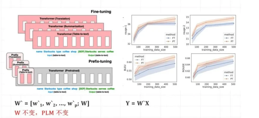核心原理: PLM(预训练模型)不变,W(模型的权重)不变,X(模型输入)不变,增加W(前缀嵌入的权重)。