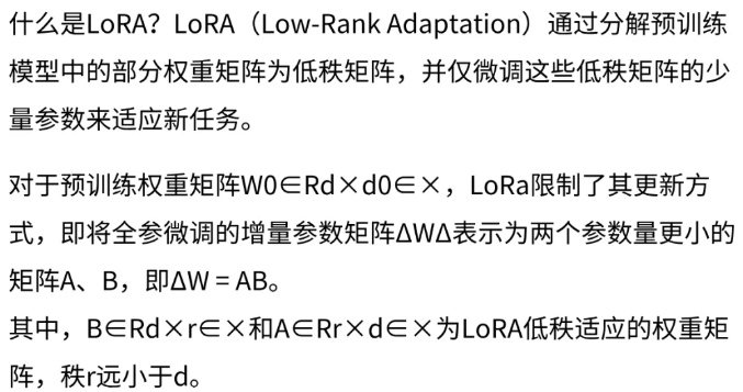 如何进行LORA微调?在冻结预训练模型权重的基础上,通过优化算法训练低秩矩阵A和B以近似增量参数,最小化下游任务损失从而实现高效的模型微调。