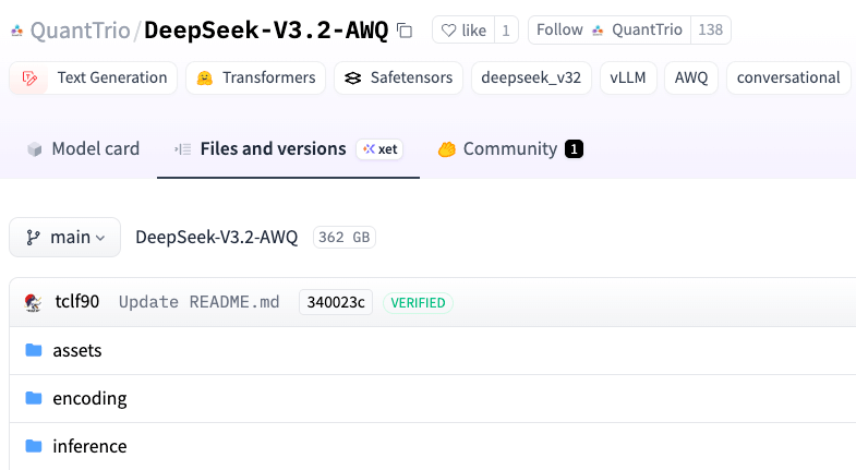 国内镜像:https://modelscope.cn/models/QuantTrio/DeepSeek-V3.2-AWQ/files 当然也有 Speciale 的镜像:https://modelscope.cn/models/QuantTrio/DeepSeek-V3.2-Speciale-AWQ