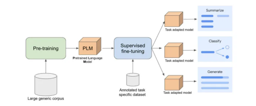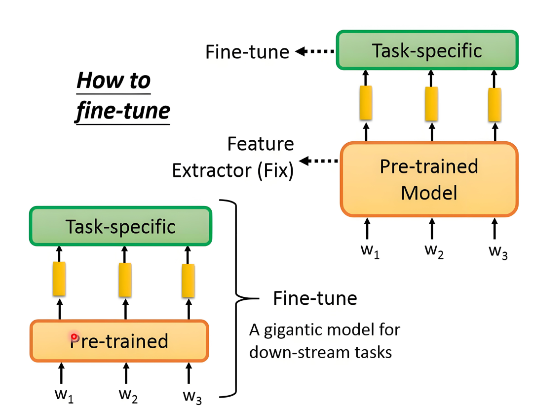 预训练阶段生成的模型通常学习了通用的特征表示,而通过微调,可以进一步在较小的、有标注的特定任务数据集上优化模型,使其更好地完成目标任务(如分类、生成、翻译等)。