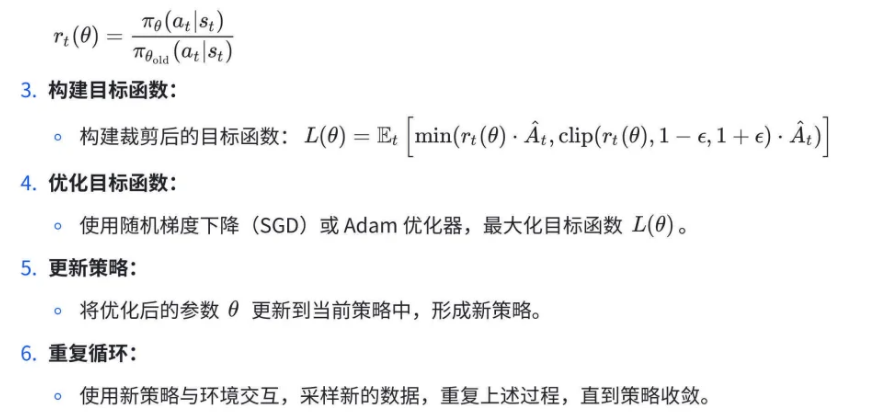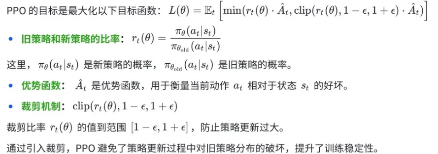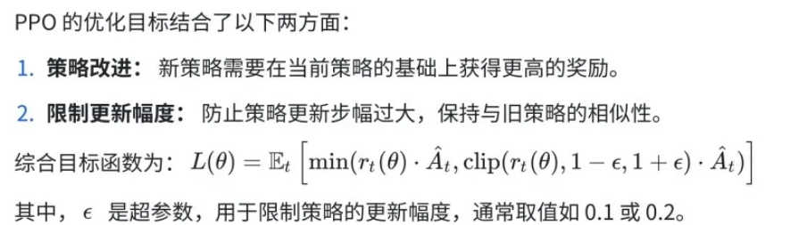 训练稳定性: 通过限制策略的变化范围,PPO在优化过程中更加稳定。