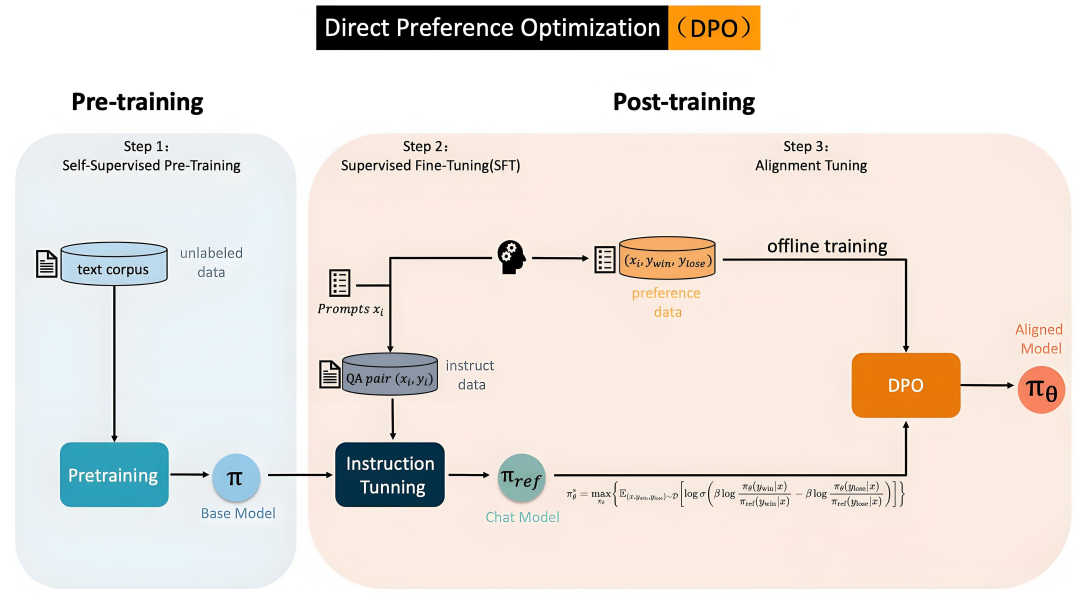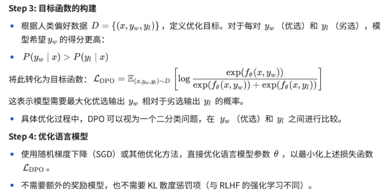 DPO通过将人类的偏好数据转化为直接优化目标,避免了强化学习中复杂的策略更新和奖励设计问题。这种方法保留了偏好信息,同时减少了优化过程的难度。
