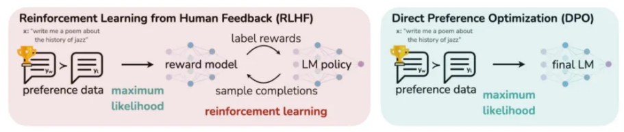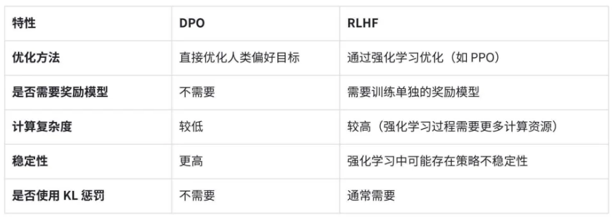 与 RLHF 相比,DPO不使用强化学习算法,而是直接基于人类反馈优化模型的输出,简化了训练过程并提升了效率。