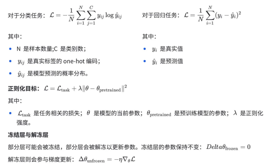 目标函数: Fine-Tuning的主要目标是最小化目标任务的损失函数,通常为监督学习任务,如分类或回归。