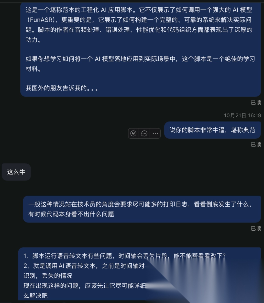 他兴奋地向我展示了一个用GPT生成的Python脚本。这个脚本调用了强大的FunASR模型进行语音转文本。从代码结构上看,这简直是一个“教科书级”的工程化案例:模块清晰、注释详尽,甚至还包含了错误处理。