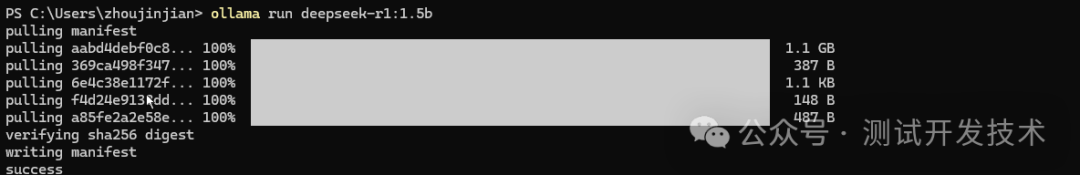 当界面出现 success 显示安装成功。说明deepseek模型已经安装到了你的本地。