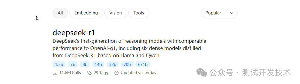 在Ollama的官网上可以进入Models页面中查看可以下载的模型,选择deepseek-r1模型