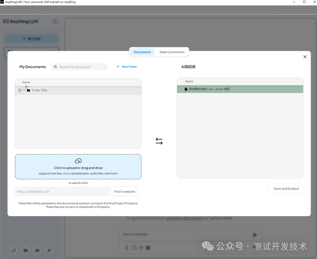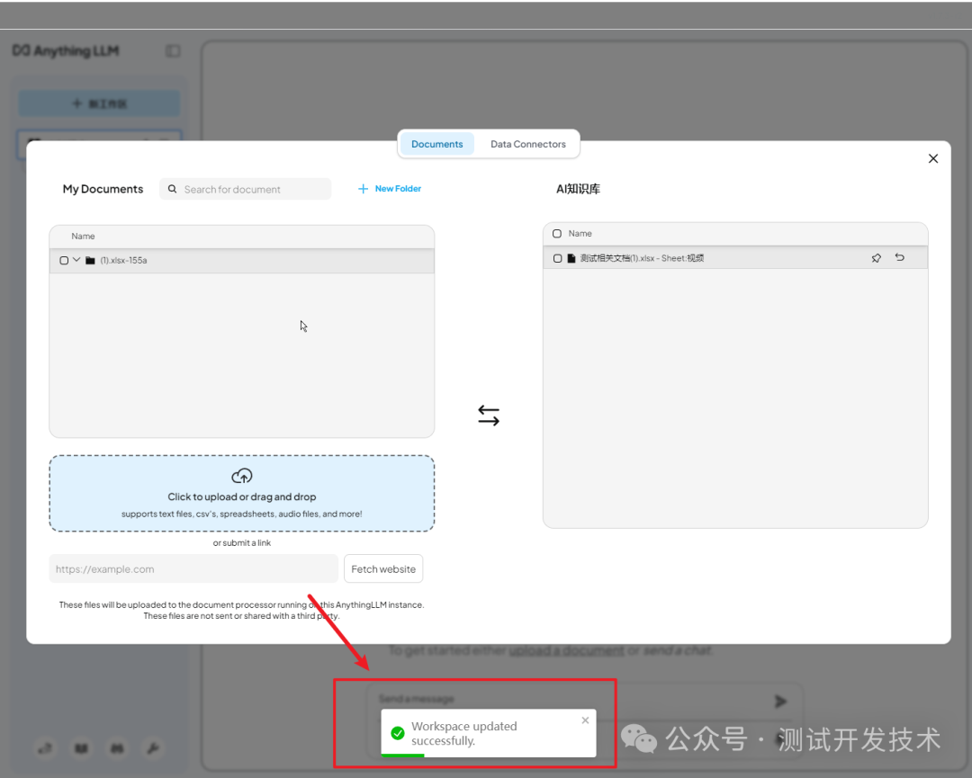 添加文档,并将文档 Move to Workspace,然后点击Save and Embed,出现 Workspace updated successfully 就表示文档上传已经完成了。