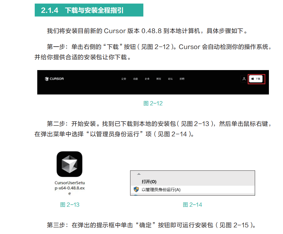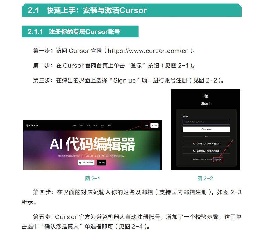 例如,在介绍Cursor的安装配置时,作者采用了极简的“三步走”模式:注册账号、下载软件、安装配置。这种清晰的步骤说明,让零基础的读者也能轻松上手。