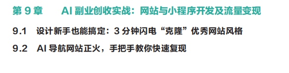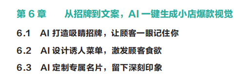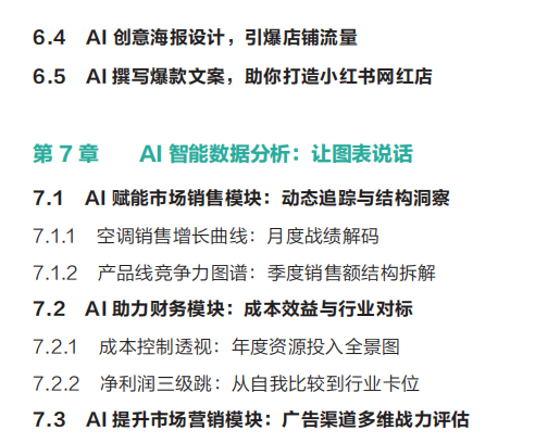 寻求技术变现的创业者也可以在书中找到适合自己的内容。例如,书中介绍了如何开发营销小程序,如何用AI打造爆款招牌和文案、海报,如何让AI进行数据分析,等等。