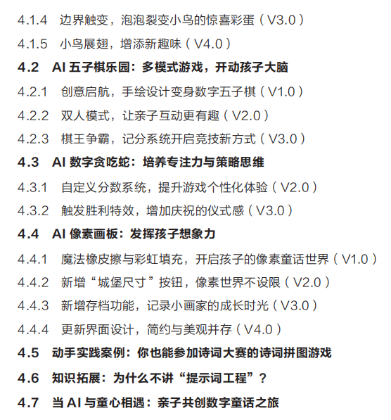 本书的另一大特色是涵盖30多个精心挑选的实战案例。这些案例覆盖从简单到复杂的多种应用场景,包括开发创意小游戏、开发教育工具、制作营销素材、开发网站与小程序,再到部署云端项目和打造AI智能体(比如智能旅行规划助手)。
