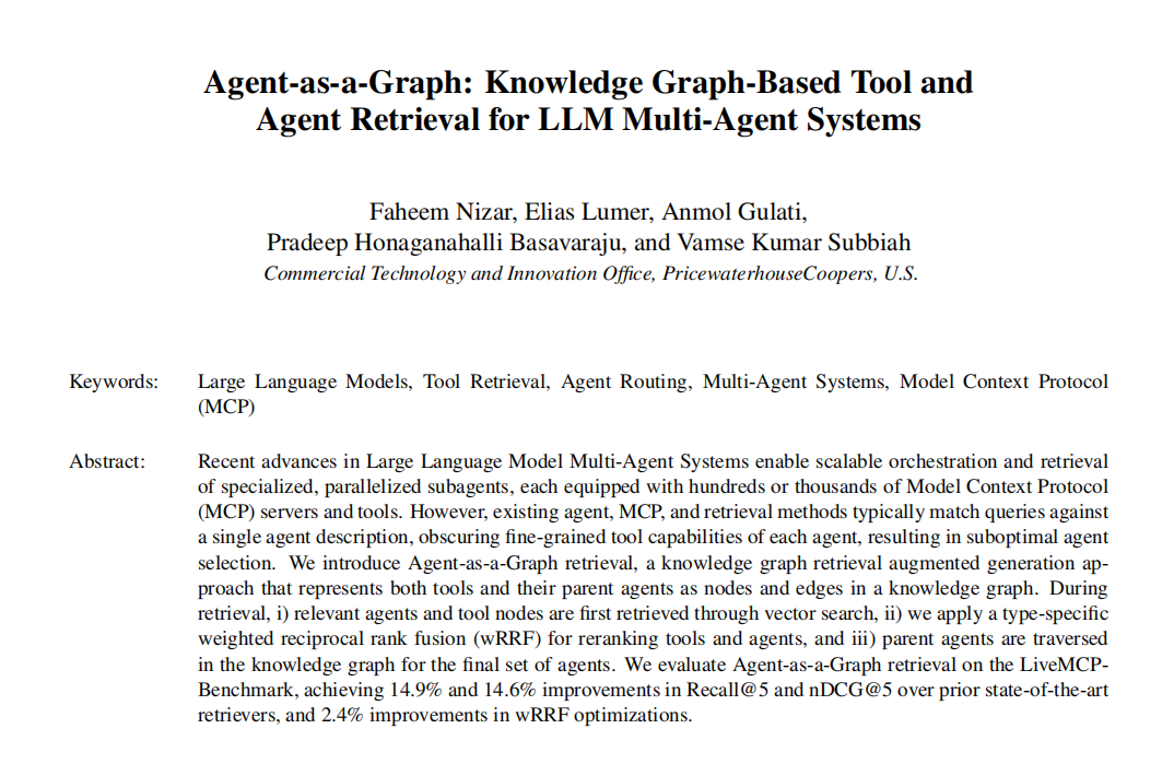 Agent-as-a-Graph是一种创新的知识图谱检索方法,通过将工具和代理表示为知识图谱中的节点和边,解决了大语言模型多智能体系统中代理选择不精准的问题。该方法采用三步检索流程(向量搜索、加权重排序、图遍历),在LiveMCP基准测试中实现了14.9%的Recall@5和14.6%的nDCG@5性能提升,结合了代理级别和工具级别检索的优势,为多智能体系统提供了更精准的代理选择方案。