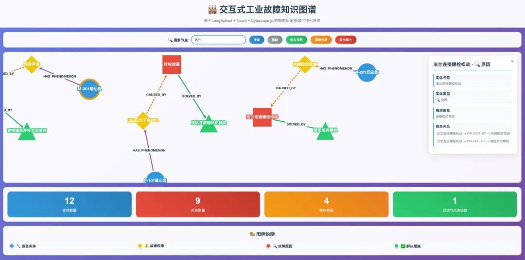 **3. Neo4j 图数据库:**知识图谱通常以图结构存储,Neo4j 是当前最流行的开源图数据库之一。选择 Neo4j 的原因在于其灵活的图数据模型和强大的图查询能力,适合表示工业设备、故障、原因、维修措施等实体及其复杂关系。Neo4j 使用 Cypher 查询语言,可以方便地进行路径查找、关联分析等操作,非常契合故障诊断中“查找可能原因”“追溯维修历史”等需求。此外,Neo4j 提供了完善的事务支持和企业级特性,适合作为工业知识图谱的存储和管理平台。在本方案中,我们将把 LangExtract 抽取得到的实体和关系导入 Neo4j,构建工业故障知识图谱。