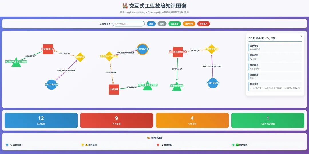 本文详细介绍了如何利用 LangExtract 和 Ollama 从工业文本中抽取知识,并经过实体对齐、Neo4j 存储和 Pyvis 可视化,构建出工业故障诊断知识图谱的全过程。我们结合实际场景提供了代码示例和图示说明,展示了从原始数据到可交互知识图谱的端到端解决方案。