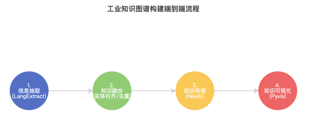 首先,使用 LangExtract 结合本地 Ollama 模型从工业文本中抽取结构化的实体和关系;然后,对抽取结果进行实体对齐和去重,解决同一实体不同表述的问题;接下来,将清洗后的知识存入 Neo4j 图数据库;最后,利用 Pyvis 将知识图谱进行可视化展示。下面我们将分步骤详细介绍各环节的实现。