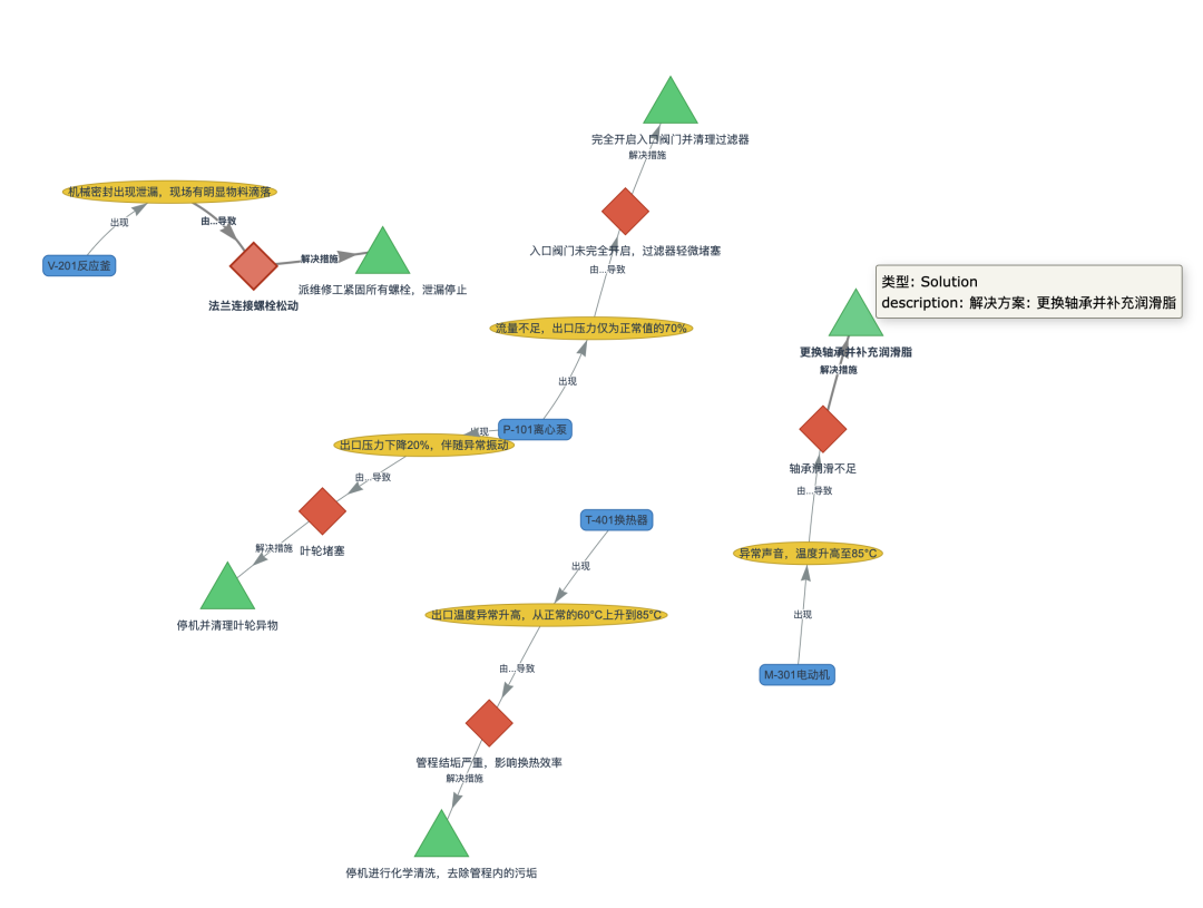 通过实体对齐与去重,我们确保了知识图谱中每个节点代表唯一的概念或对象。例如,所有文档中提到的“P-101离心泵”都会被统一为一个节点,其别名或简称作为属性记录。这样处理后,就可以将清洗后的知识存入图数据库,进行持久化管理和查询分析。
