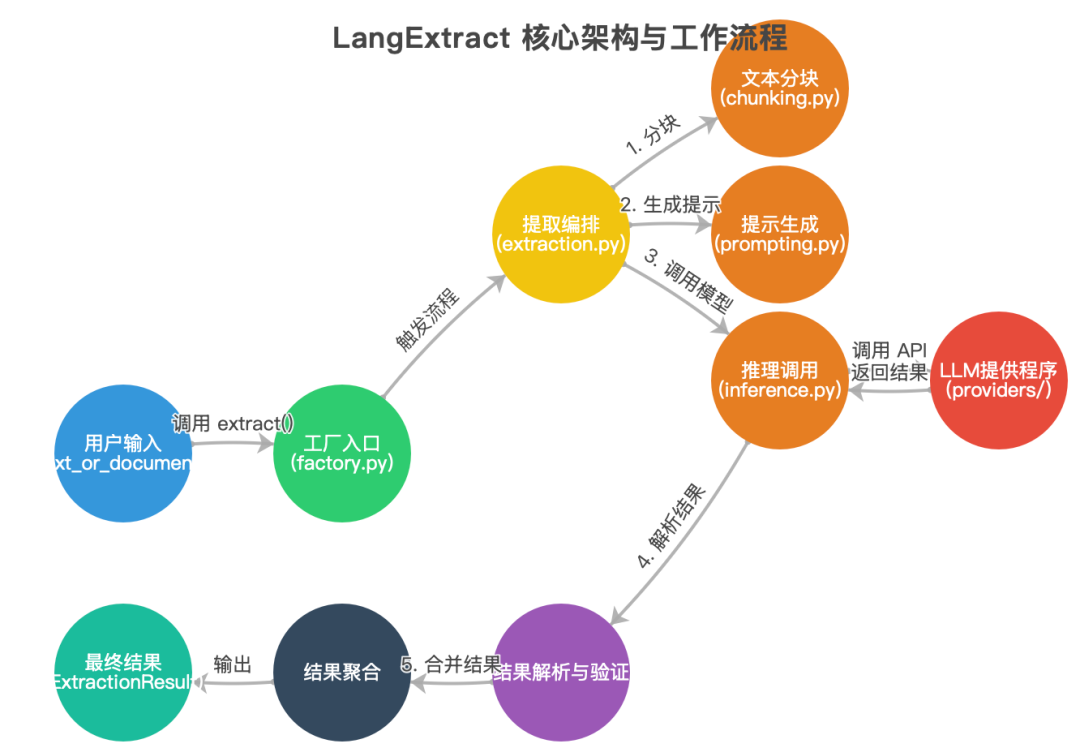 **1. LangExtract 信息抽取框架:**LangExtract 是 Google 于2025年开源的指令式信息抽取框架,可同时兼容多种 LLM 模型,包括云端的 Google Gemini、OpenAI 模型,以及本地的 Ollama 模型。它通过“分块+并行+多遍扫描”的策略优化长文档处理,提高信息召回率,并确保每个抽取结果都有明确的原文出处(精确溯源)。LangExtract 采用 Schema 驱动的方式,只需提供少量示例和清晰的提示,即可让 LLM 按照指定格式输出结构化信息,避免了传统方法对大量标注数据的依赖。其“Few-Shot 示例引导”机制允许用户通过一两个高质量标注示例教会模型期望的输出格式。这些特性使 LangExtract 非常适合工业场景下复杂文本的信息抽取,在灵活性、准确性和可追溯性之间取得了平衡。