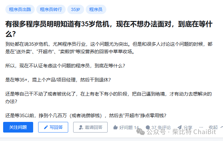 程序员的 “35 岁危机”,这事儿就像一把达摩克利斯之剑,高悬在每个程序员头顶。知乎上有个大厂码农就说,自己上班卷得不行,下班就想躺平休息,根本没余力思考未来。直到同组的同事被裁,他才如梦方醒,开始琢磨咋应对这危机。咱今天就唠唠这事儿,看看程序员们到底在等啥。