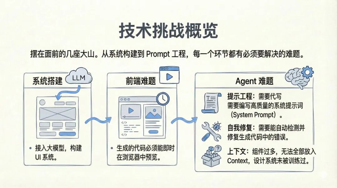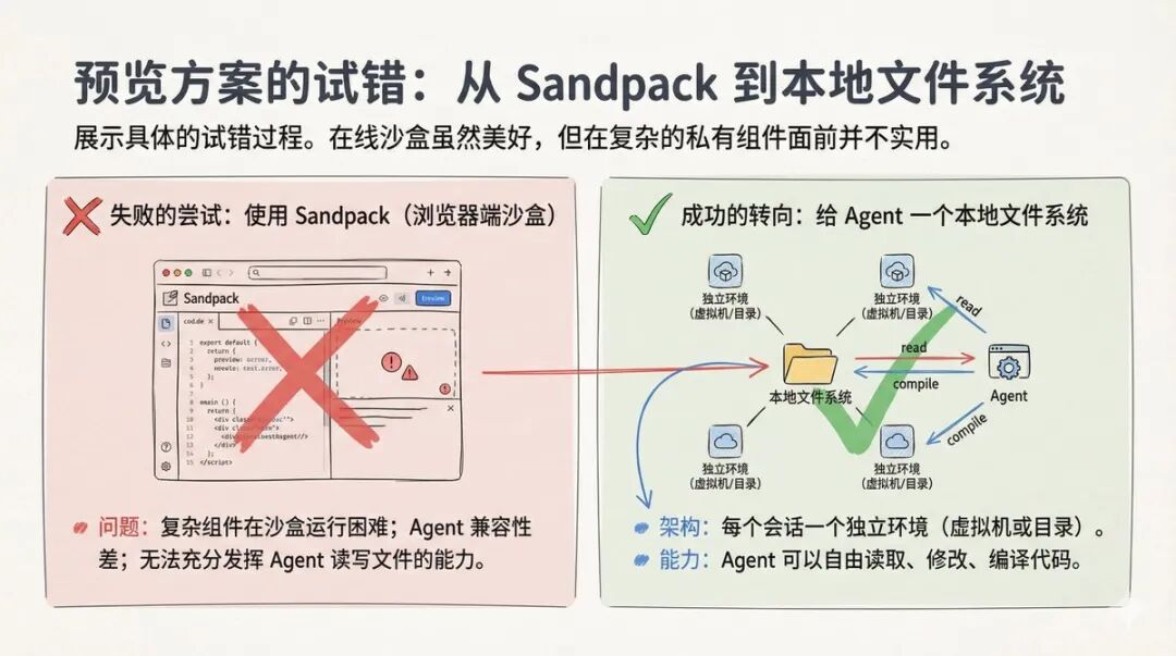 一开始我们尝试用 Sandpack(浏览器端沙盒)做代码预览,结果发现复杂组件根本跑不起来,而且无法发挥 Agent 读写文件的能力。