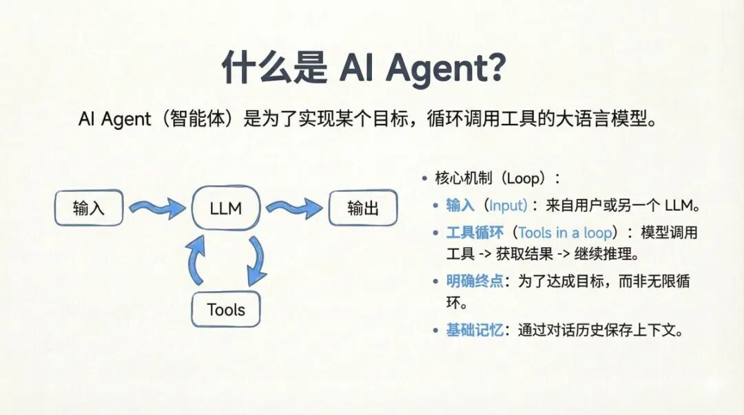 AI Agent(AI 智能体),是为了实现某个目标,循环调用工具的大语言模型。