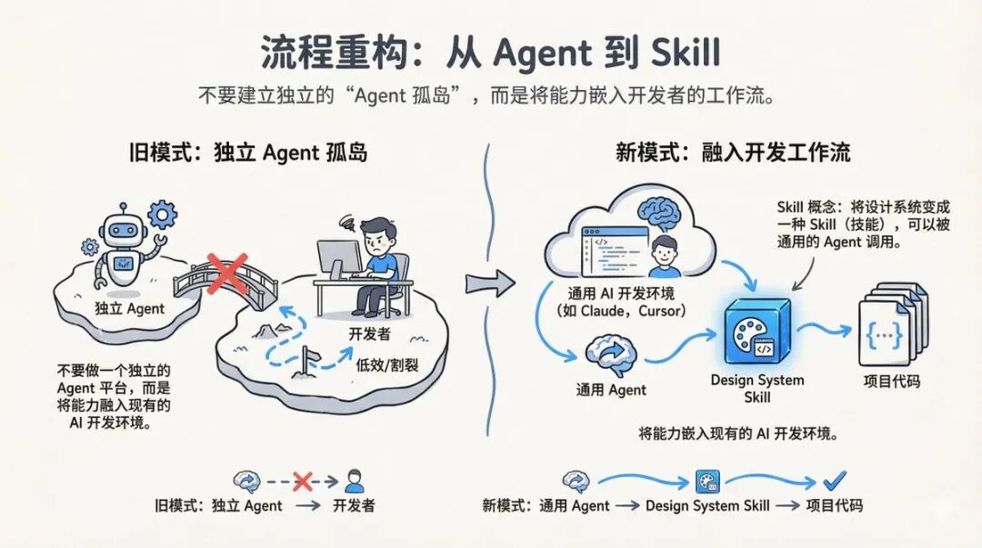新模式是"融入开发工作流"——把设计系统变成一种 Skill(技能),可以被通用的 Agent(如 Claude Code、Cursor)调用。