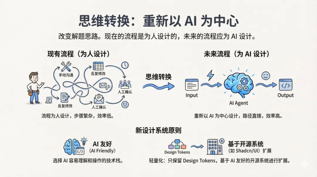 我们常说"以用户为中心",但在 AI 时代,可能需要增加一层:以 AI 为中心设计工作流,再让用户享受这个高效流程的成果。不是让 AI 模仿人的工作方式,而是重新设计工作方式让 AI 更高效。