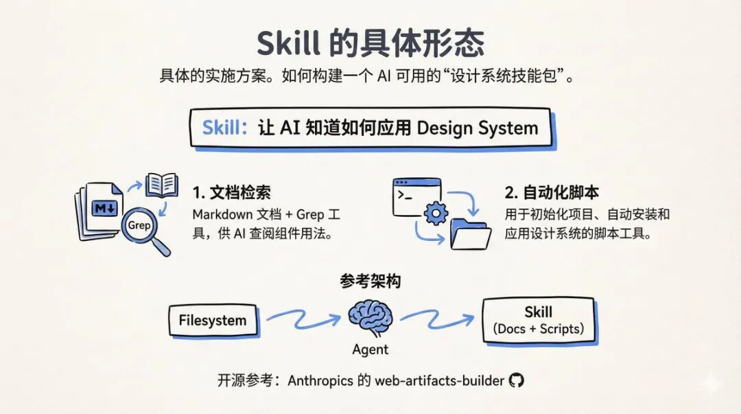 Skill 的具体形态很简单:Markdown 文档(供 AI 查阅组件用法)+ 自动化脚本(用于初始化项目、自动安装和应用设计系统)。