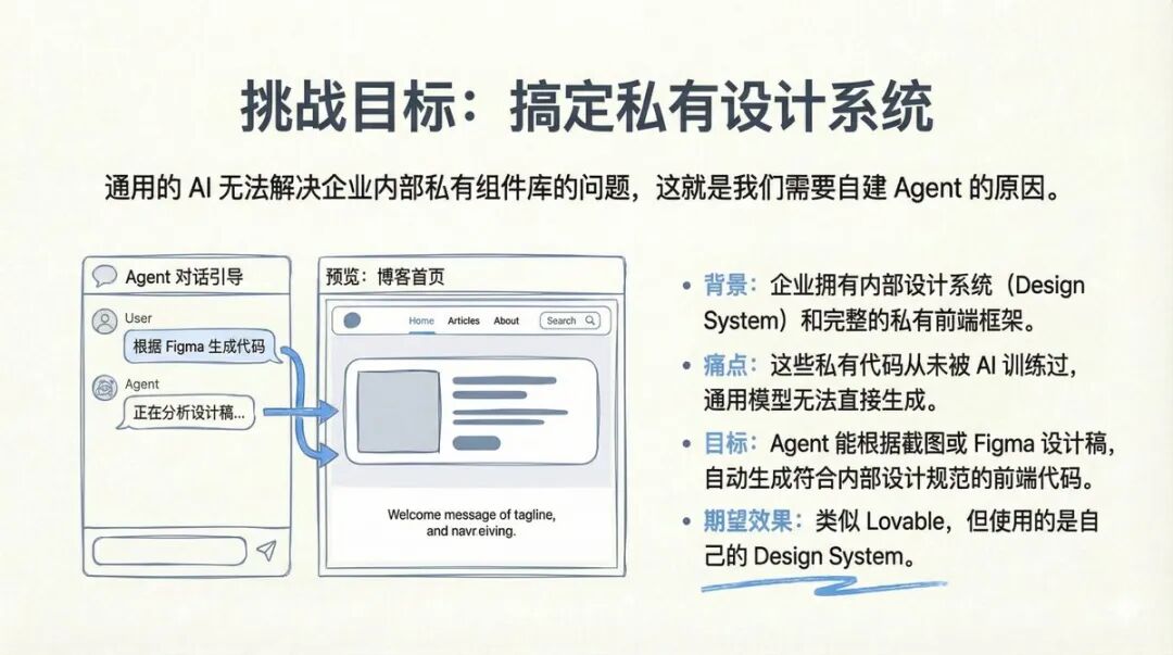 朋友负责的团队面临的是一个真实的企业痛点:公司有完整的内部设计系统(Design System)和私有前端框架,但这些代码从未被 AI 训练过,通用模型根本无法直接生成符合规范的代码。