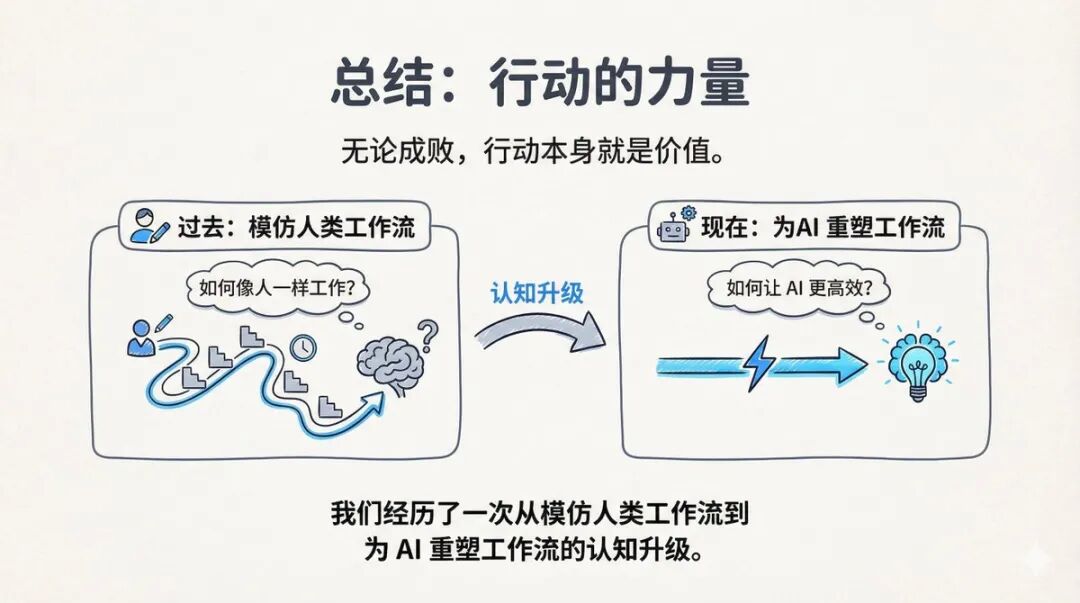 即使这个项目"失败"了,团队获得的认知升级是无价的。从模仿人类工作流到为 AI 重塑工作流,这种思维转变只有在实践中才能获得。