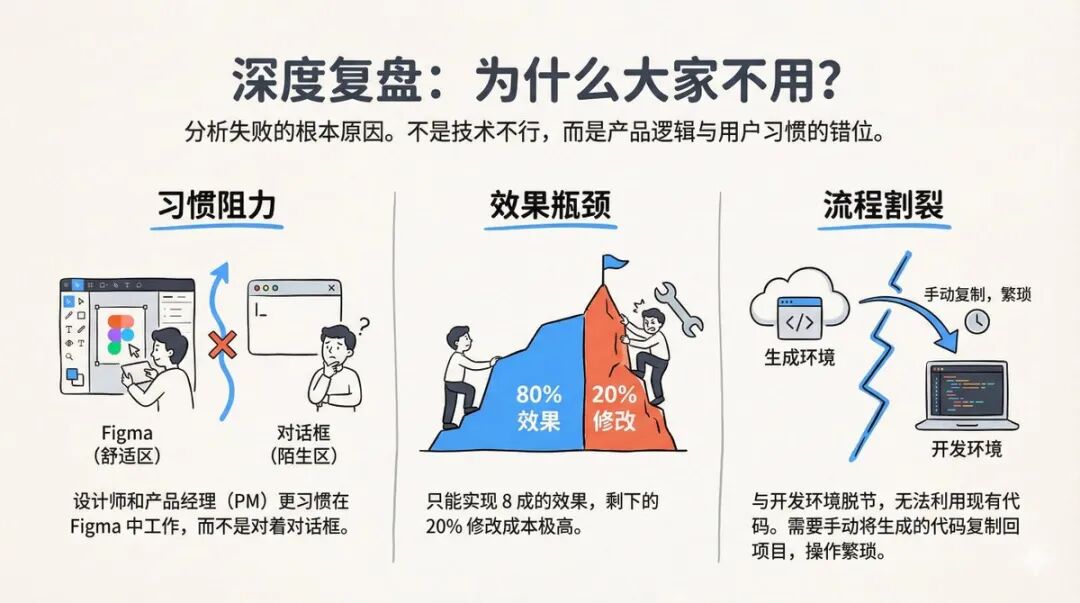 文章通过AI Agent前端落地案例,讲述了团队从技术成功到产品失败再到认知升级的历程。团队解决了代码预览、AI学习私有组件等技术难题,但因产品逻辑与用户习惯错位导致使用率低。通过复盘,提出应从构建独立Agent转向将能力封装为Skill嵌入现有AI开发环境,总结出技术成功≠产品成功、AI产品需"以AI为中心"思考等关键洞见。