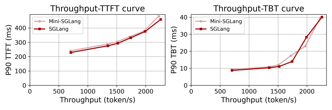 在Qwen3-32B模型、4张H200显卡的实际工作负载测试中,mini-SGLang展现了与完整版相近的性能表现。