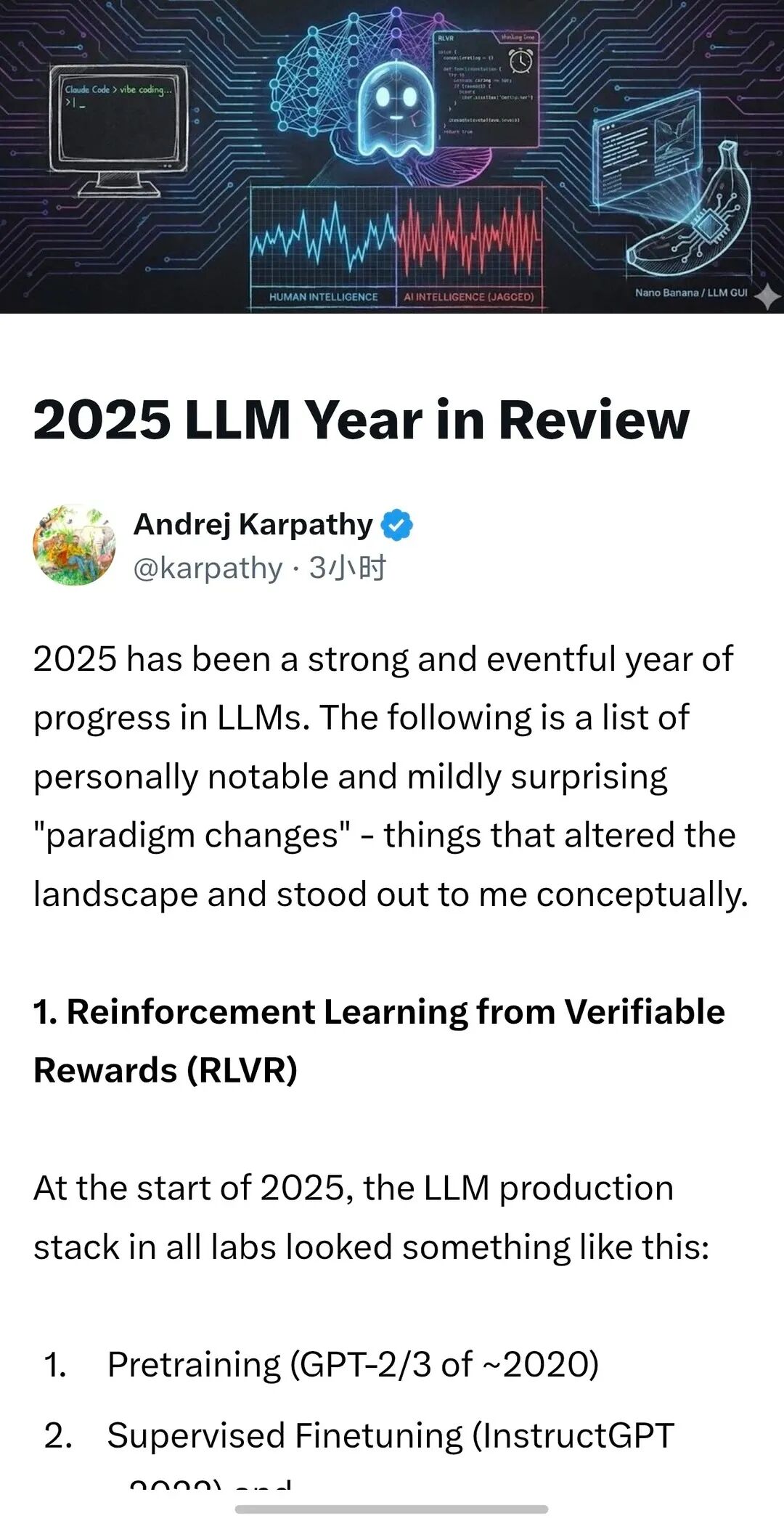 AndrejKarpathy前几天发了一篇2025年LLM年度回顾。他是OpenAI联合创始人、前特斯拉AI总监,也是全球最有影响力的AI研究者之一。这篇文章里有6个观点,每一个都理解得非常深刻。强烈推荐大家看看。
