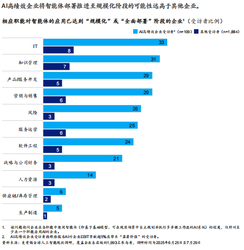 - 投资更坚决:超过三分之一的高绩效企业将20%以上的数字化预算投向AI,支撑其全面扩张。约四分之三的高绩效企业已处于规模化部署阶段,而其他企业这一比例仅为三分之一。