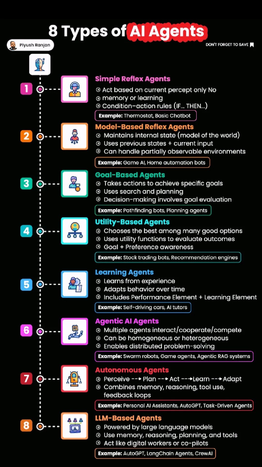 在由智能体构成的浩瀚宇宙中,不同的架构决定了它们各自的用途,它们不仅能“回答问题”,还能感知环境、做出决策甚至自主执行任务。无论你是想要构建一个简单的自动化脚本,还是部署一套复杂的企业级自主系统,理解这 **8种核心 AI Agent(智能体)**都是必要的。