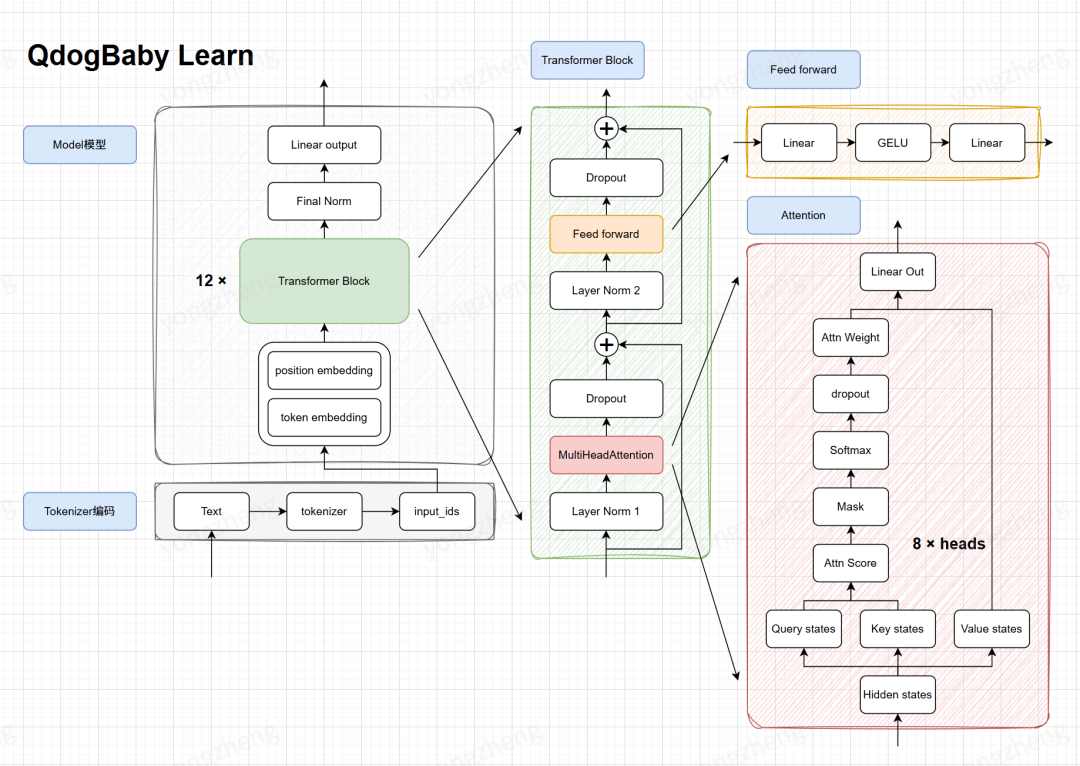 - 简单但完整的模型结构,结构主要参考 GPT2,从零构建。