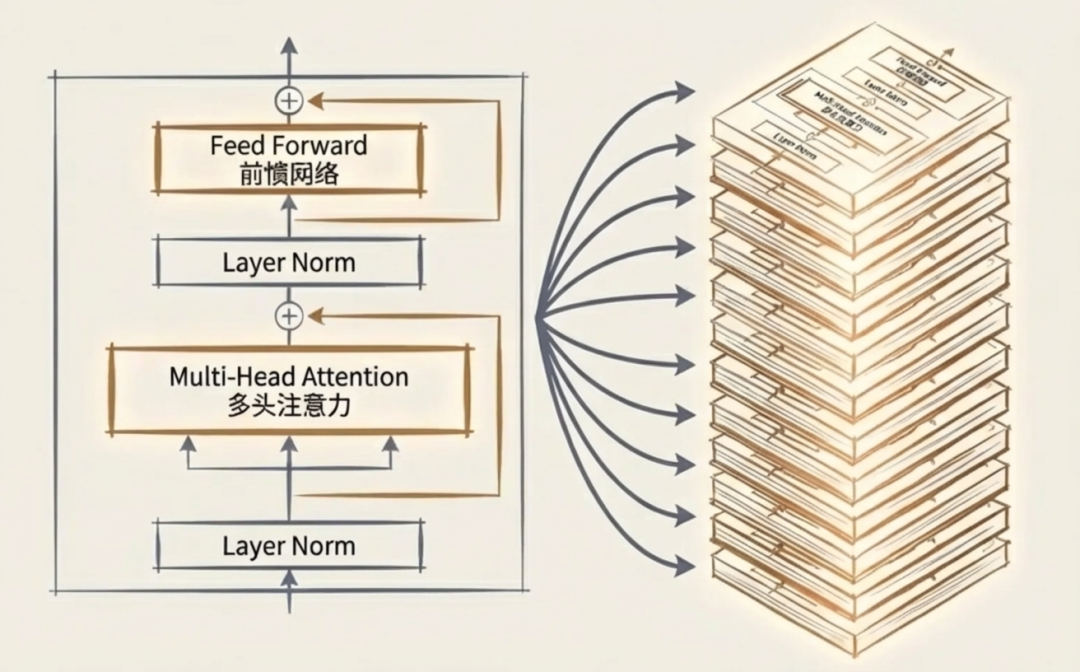 来设计我们的 transformerblock,相对于论文原始结构,我们将 Norm 层提前,这是目前 LLaMA、Qwen 等主流大模型普遍采用的结构,比原始 Transformer 的 Post-Norm 训练更稳定。