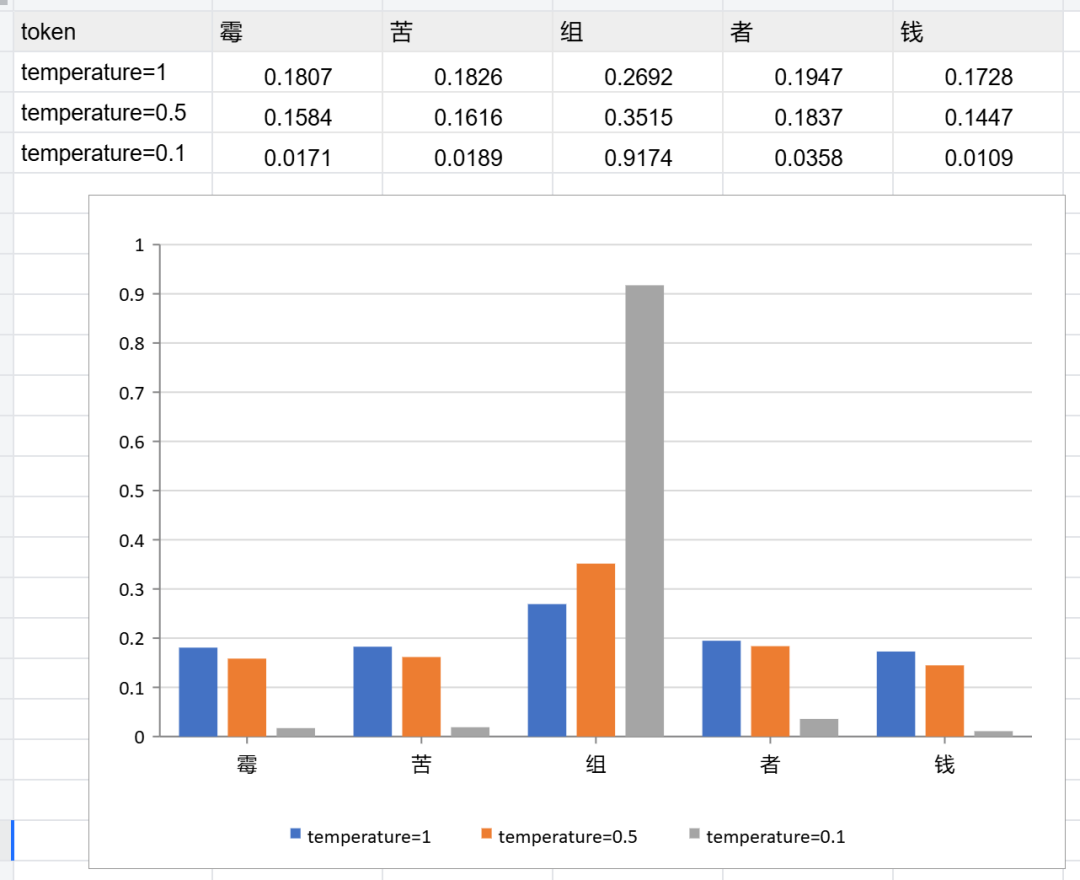 # QQ浏览器广告后台开发 + ???# vocab: [霉, 苦, 组, 者, 钱]probas = torch.tensor([0.1145, 0.1245, 0.5130, 0.1887, 0.0694])print(torch.softmax(probas, dim=-1))temperature = 0.5print(torch.softmax(probas/temperature, dim=-1))temperature = 0.1print(torch.softmax(probas/temperature, dim=-1))print(torch.topk(probas, k=4, dim=-1))