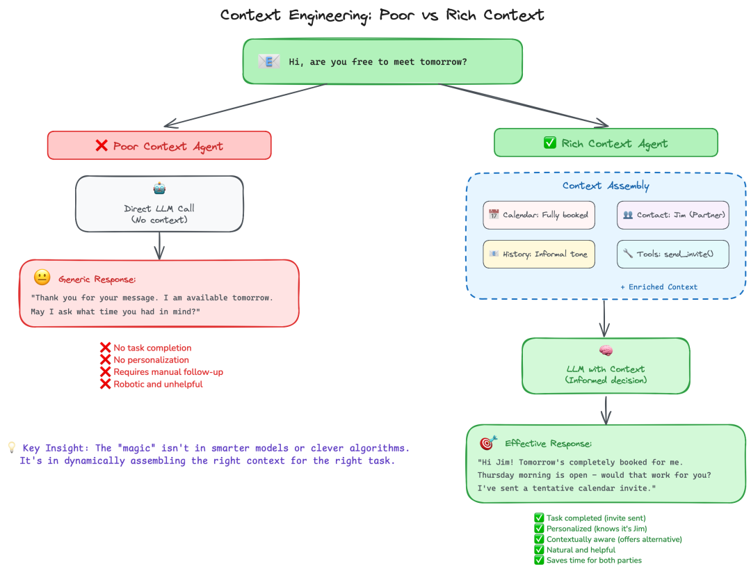 - 上下文贫乏的 AI: “感谢您的消息。我明天有空。请问您希望约在什么时间?” (无效回复,未推进任务)