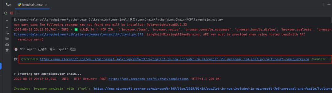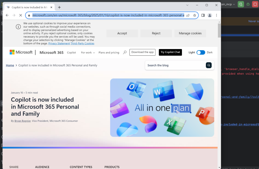 - 编写主函数执行智能体,本期分享使用与上篇相同的案例,要求智能体爬取Copilot官方介绍页并总结相关内容, 提示词为"访问这个网站 https://www.microsoft.com/en-us/microsoft-365/blog/2025/01/16/copilot-is-now-included-in-microsoft-365-personal-and-family/?culture=zh-cn&country=cn 并帮我总结一下这个网站的内容",执行结果如下,可以看到PlayWright MCP自动打开浏览器并导航到相关页面进行爬取分析: